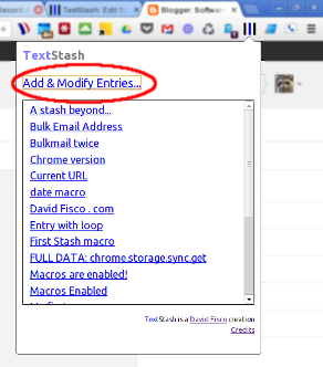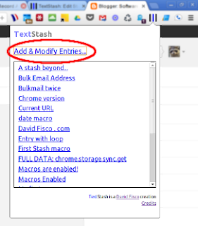 If you'd like to try it out, go to Google and install TextStash. When you click on the TextStash icon for the first time, you'll see a link to "Add & Modify Entries".
